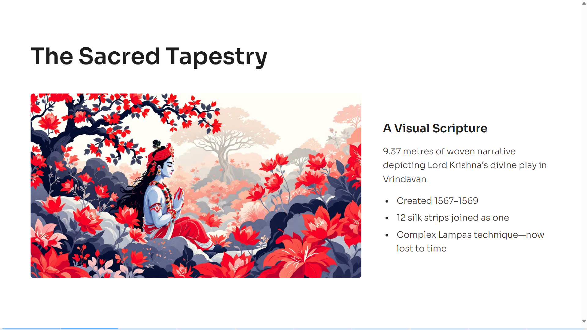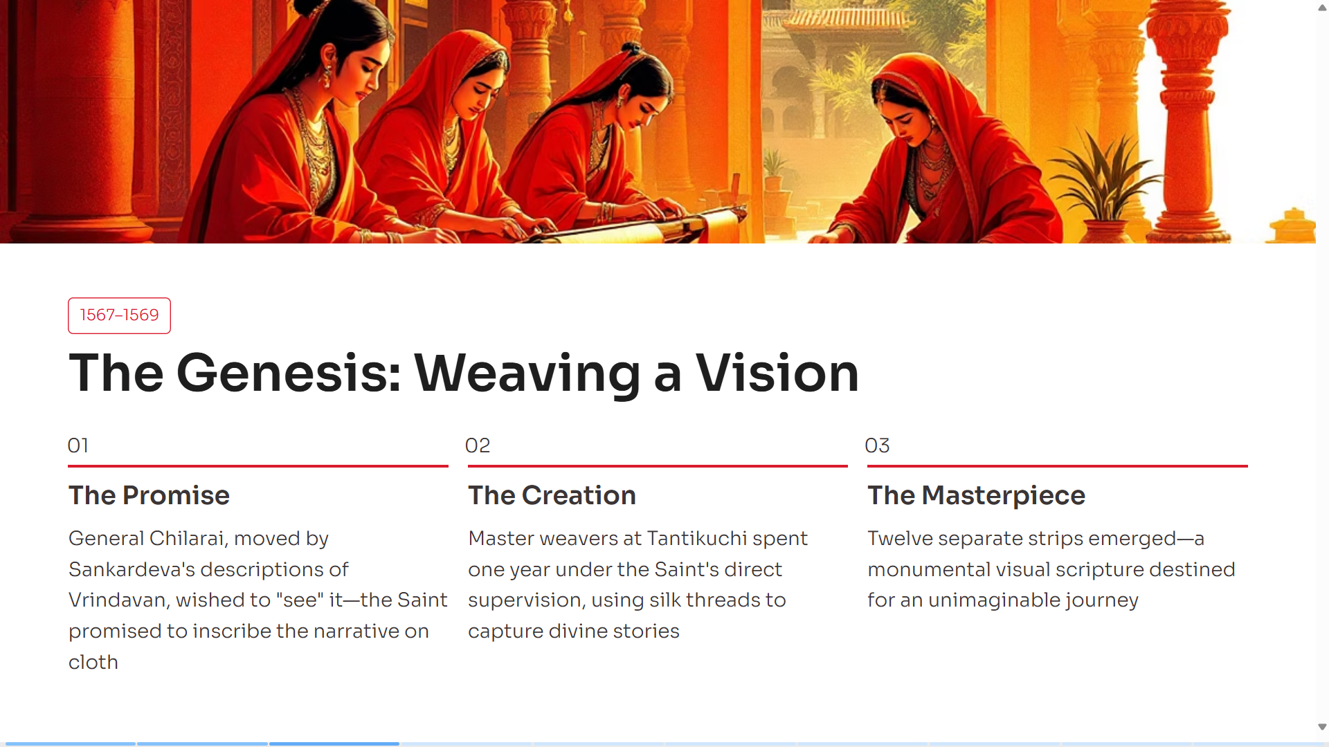 Under the Saint’s direct supervision, the weavers of Tantikuchi (modern-day Barpeta) spent roughly one year using the complex, now-lost Lampas technique. They wove 12 separate strips of silk, which were eventually joined to create a monumental visual scripture.