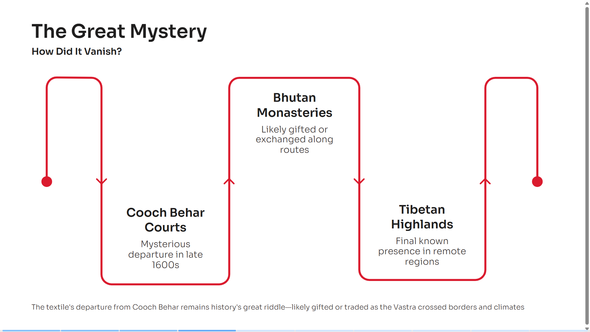 • The Bhutan Connection: Historical records suggest the textile first moved north into Bhutan, possibly as a diplomatic gift to a Buddhist monastery.