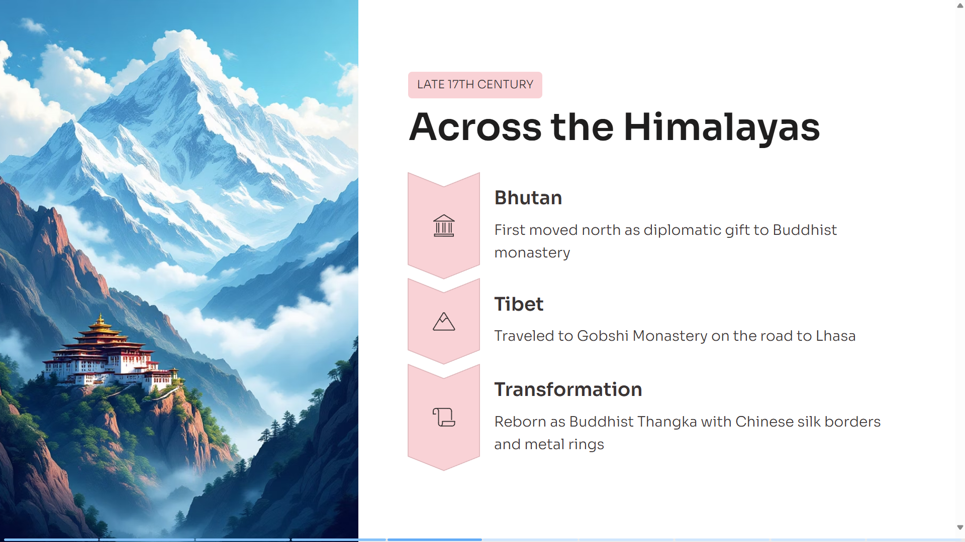 • The Tibetan Transformation: From Bhutan, it traveled across the Himalayas into Tibet. It was discovered in the Gobshi Monastery (on the road to Lhasa).