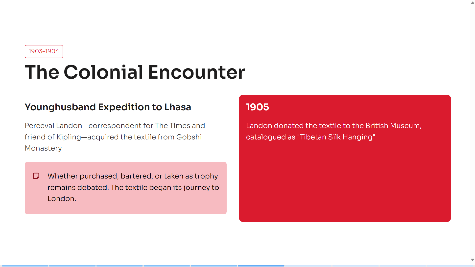 While in the Gyantse region of Tibet, Landon acquired the textile from the Gobshi Monastery. Whether it was purchased, bartered, or taken as a trophy remains a subject of debate. In 1905, Landon donated the textile to the British Museum, labeling it as a “Tibetan Silk Hanging.”